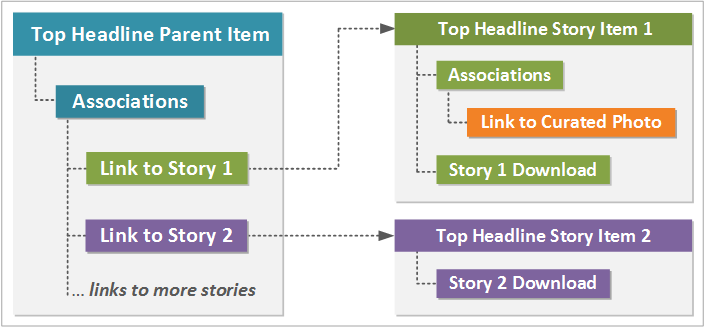 Each of the individual story items linked to the AP Top Headline parent item may have its own associated items, such as linked pictures and/or videos.