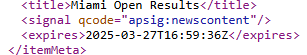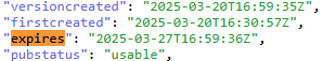 Example: The versionCreated and firstCreated fields in NewsML-G2<itemMeta> ... <versionCreated>2025-01-16T22:17:26Z</versionCreated> ... </itemMeta> Metadata field added to JSONThe "expires" property has been added to the JSON content item metadata. This field contains the date and time after which the content item is no longer considered valid or publishable by the AP. When available, this field is returned by default in the Search, Feed, On-Demand and Item Metadata responses in the JSON format.