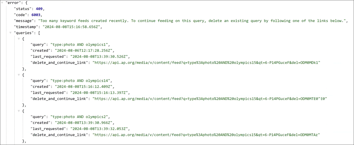 There is a limit on the number of query-based feeds that you can create. If you exceed that limit, you will get the 409 Status Code - 6003 Detail Code error and will be asked to delete an existing feed by following one of the links returned in the queries.delete_and_continue_link properties in the error message: